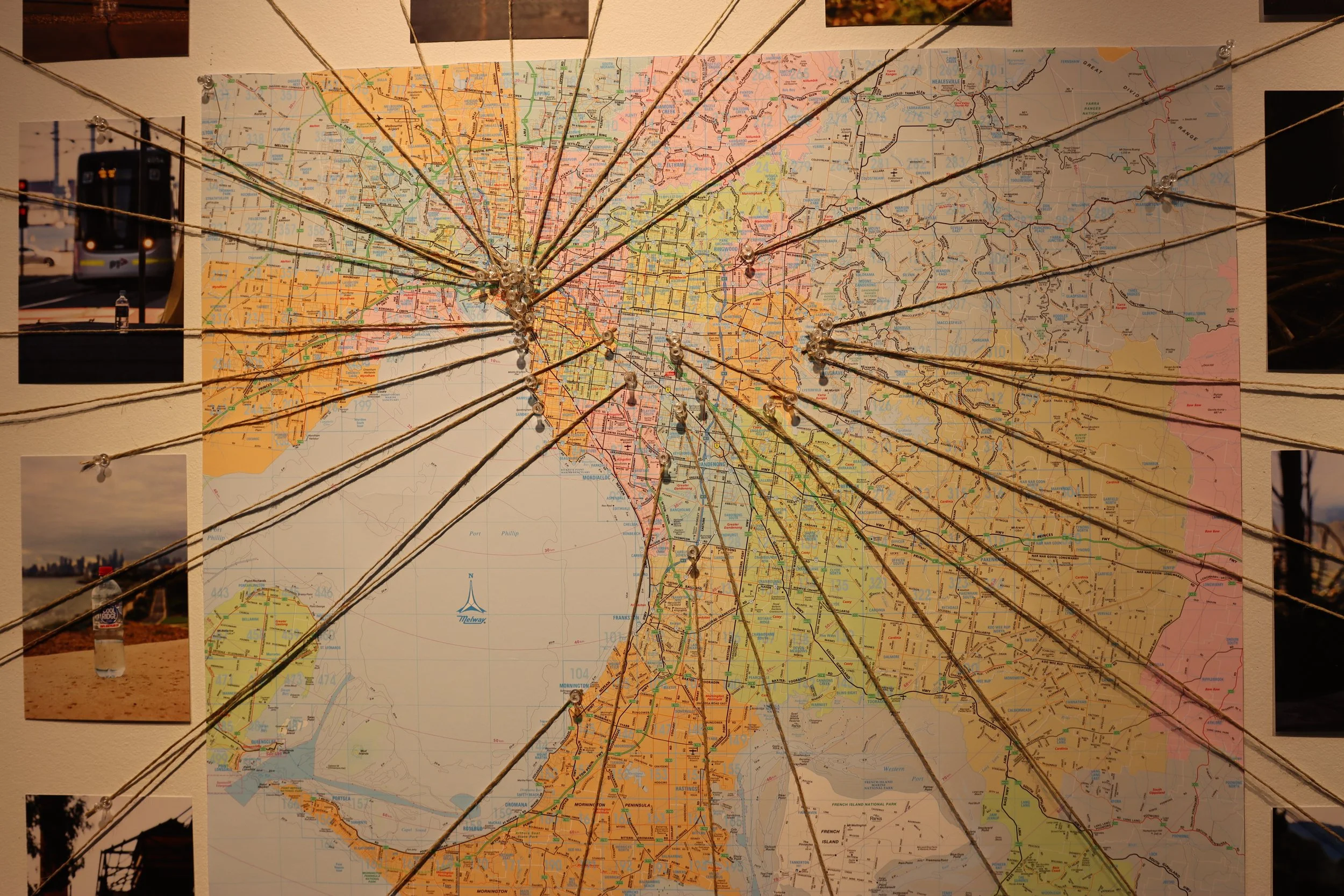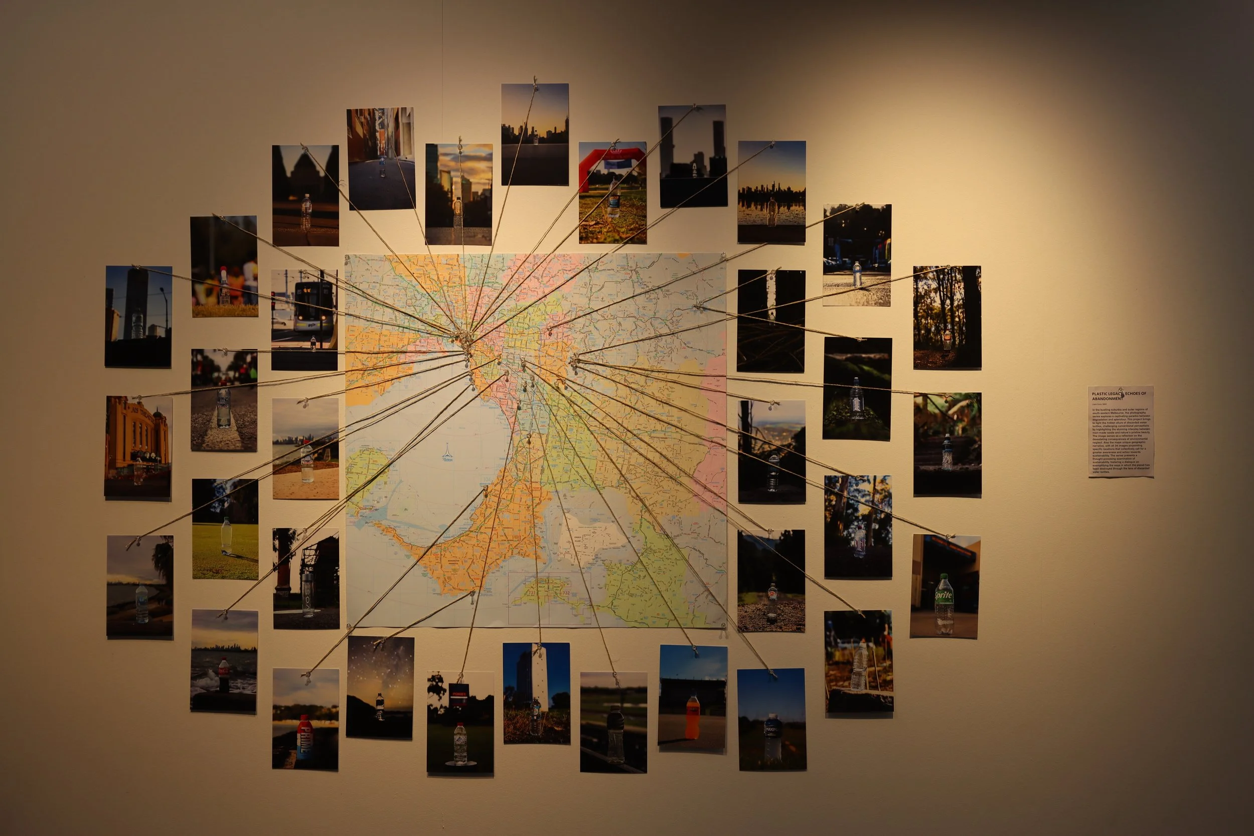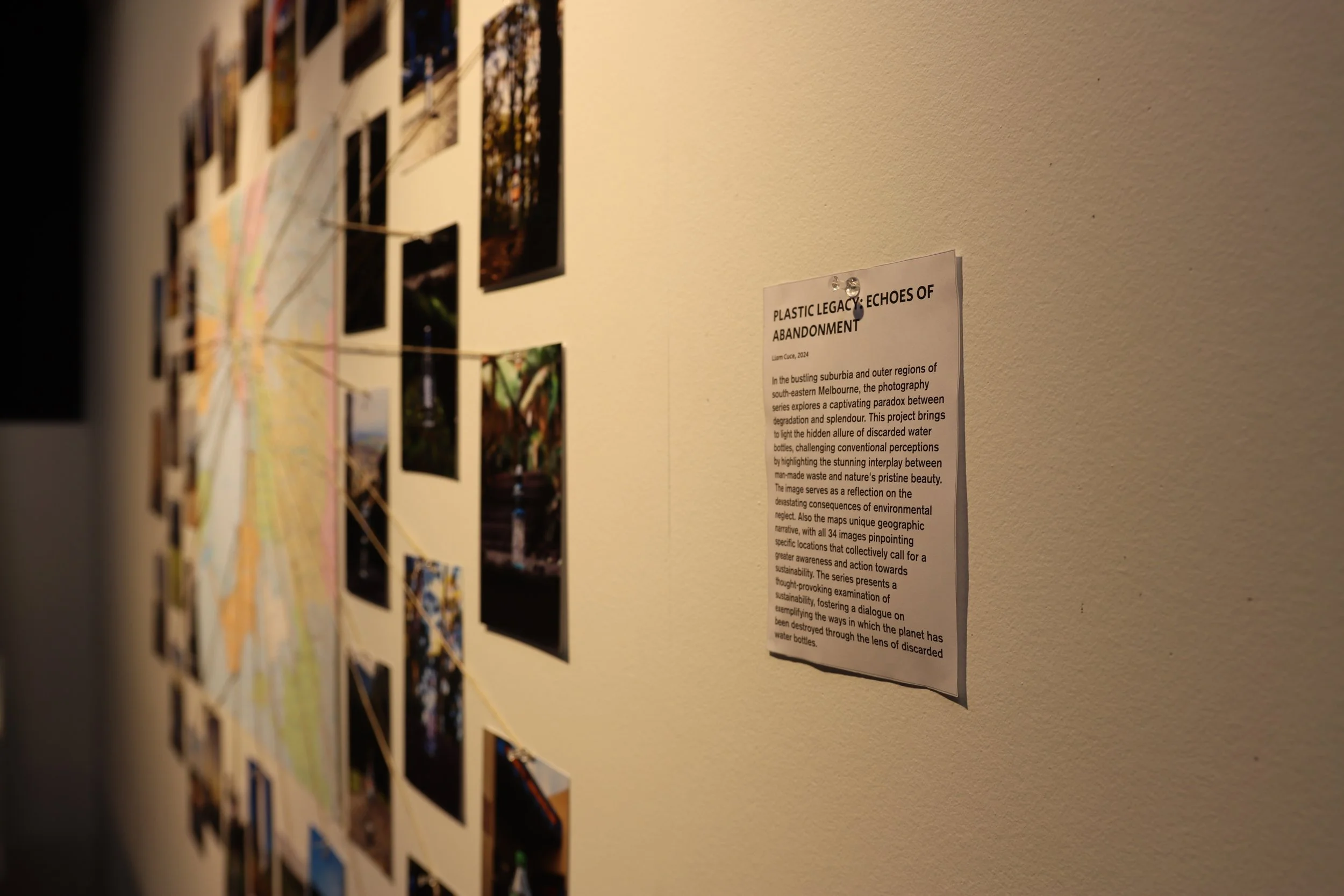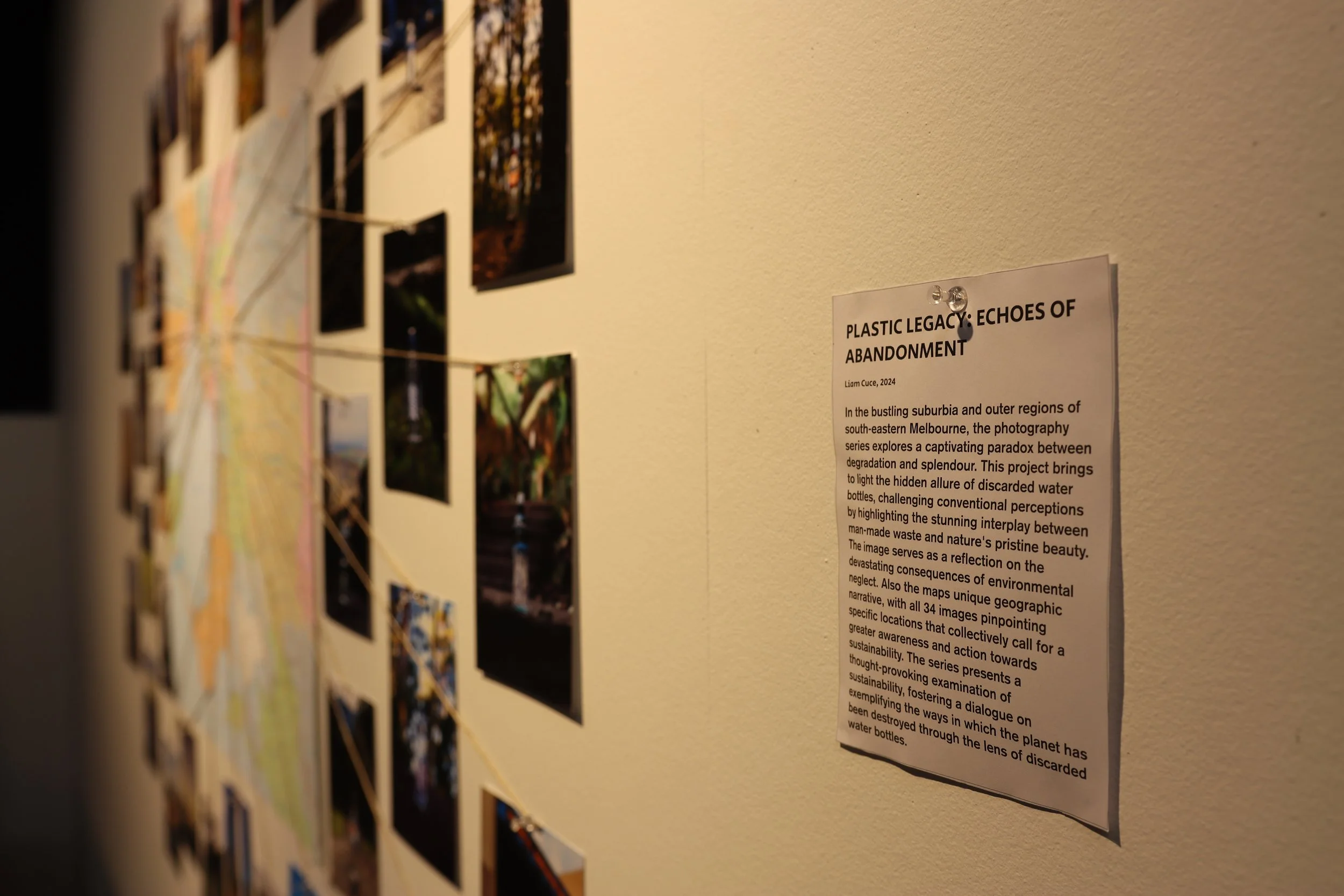 In the bustling suburbia and outer regions of south-eastern Melbourne, the photography series explores a captivating paradox between degradation and splendour. This project brings to light the hidden allure of discarded water bottles, challenging conventional perceptions by highlighting the stunning interplay between man-made waste and nature's pristine beauty. The image serves as a reflection on the devastating consequences of environmental neglect. Also the maps unique geographic narrative, with all 34 images pinpointing specific locations that collectively call for a greater awareness and action towards sustainability. The series presents a thought-provoking examination of sustainability, fostering a dialogue on exemplifying the ways in which the planet has been destroyed through the lens of discarded water bottles.